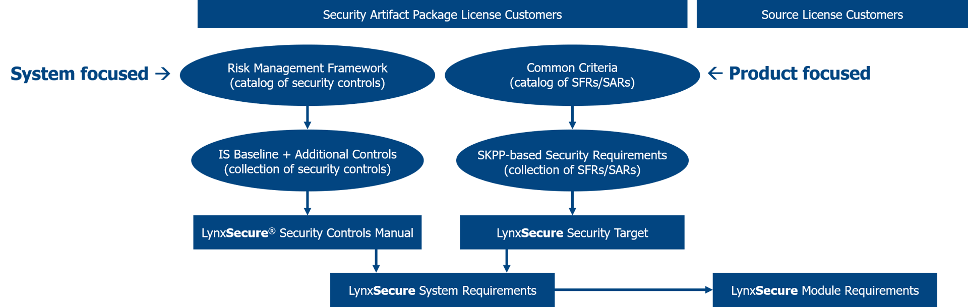 Lynx offers a DoD Risk Management Framework guide to aid the US Army’s security evaluation of the security enforcing properties of the platform (Figure 6 - Security Certification Guide Document Overview). The package includes NIST security control traceability and Common Criteria Security Target traceability into the underlying kernel design requirements.