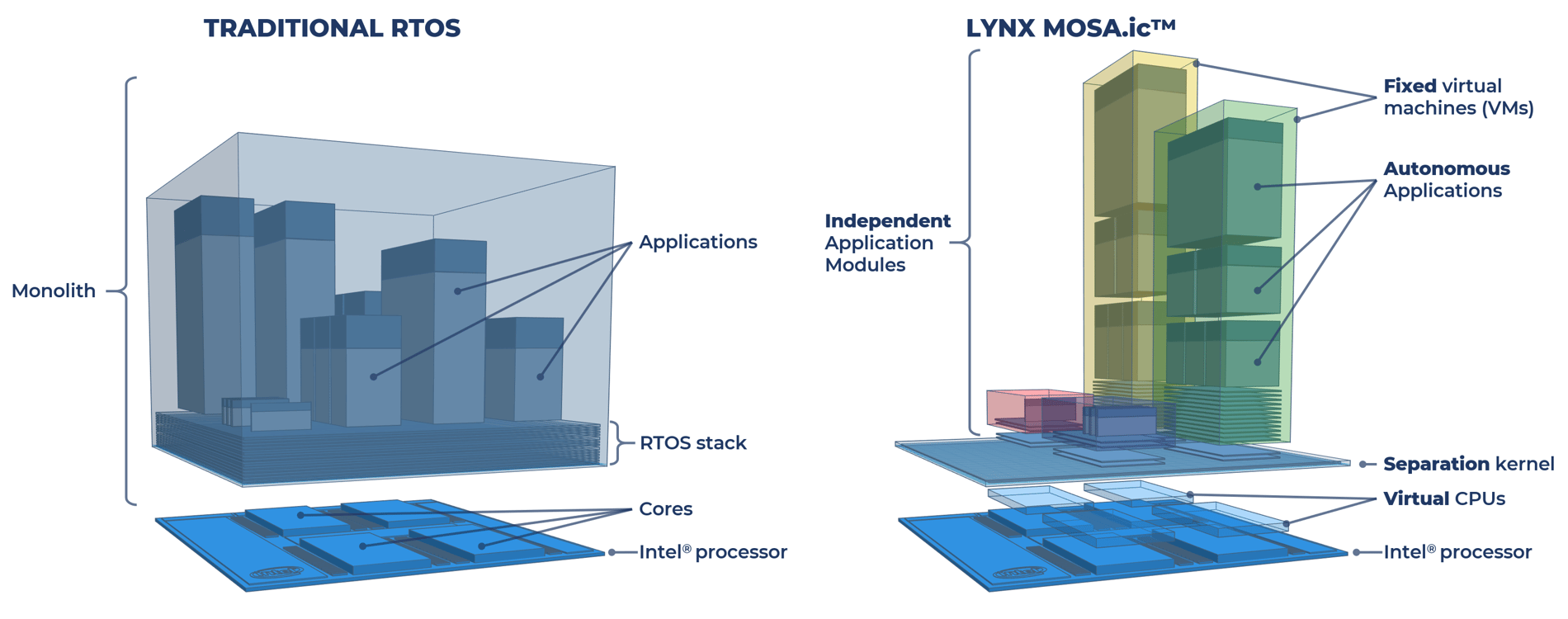 In a traditional platform (left diagram), all hardware resources are owned by the real-time operating system (RTOS), which controls CPU cores, memory, and peripherals. It is a monolithic block of code that manages task scheduling, memory partitioning, and device I/O, all of which must be safety certified to the same level and bug-free to be secure. LYNX MOSA.ic™ (right) is based on the LynxSecure® separation kernel, which relies on Intel’s native hardware virtualization to do the heavy lifting. This creates efficient, tamper-proof, and non-bypassable virtual machines (VMs). Hardware resources are robustly partitioned into almost zero overhead VMs populated with a mix of OSes, RTOSes, and bare-metal applications. This partitioning allows systems to be built consisting of multiple safety levels, minimizing high design assurance levels (DALs).